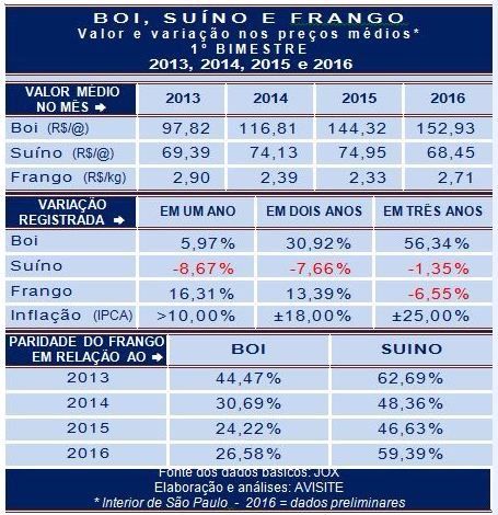 Como está encerrando os dois primeiros meses do corrente exercício com um valor médio 16,31% superior ao de idêntico período de 2015, o frango vivo aparenta estar em melhor situação que o boi em pé, cujo preço, neste ano, anda perto de 6% acima do alcançado no ano passado. E melhor ainda que o suíno, por ora registrando valor médio mais de 8% inferior ao do primeiro bimestre de 2015.