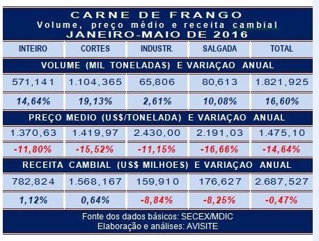 Embora tenha obtido aumento de volume proporcionalmente menor (+14,64%), o frango inteiro registra agora incremento de receita (+1,12%) superior ao dos cortes. Fato decorrente, sobretudo, de uma melhor recuperação do preço médio – ainda negativo, mas agora menos de 12% inferior ao dos mesmos cinco meses de 2015.