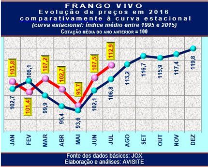 Se tiver por base, exclusivamente, a curva sazonal de preços do produto, alguém menos avisado pode concluir que o desempenho do frango vivo no decorrer de 2016 vem se colocando acima das expectativas.