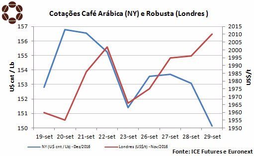 Na ICE Futures US, o vencimento dezembro do Contrato C foi cotado, na quinta-feira, a US$ 1,5015 por libra-peso, com queda de 125 pontos em relação ao fechamento da semana passada. O vencimento novembro do contrato futuro do robusta, negociado na ICE Futures Europe, encerrou o pregão de ontem a US$ 2.020 por tonelada, com valorização US$ 44 em relação à última sexta-feira. Esta foi a maior cotação dos últimos 19 meses para um vencimento com liquidez elevada e reflete a preocupação com perdas na temporada 2016/17 de robusta devido aos efeitos da estiagem nas principais regiões produtoras do mundo.