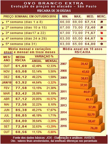 Em outubro, pelo terceiro mês consecutivo, o ovo registrou queda de preço em relação ao mês anterior. A redução mensal, de 5,88%, sobe para expressivos (e preocupantes) 21% se considerado o valor alcançado em julho último, ocasião em que se obteve a melhor cotação nominal de 2016.
