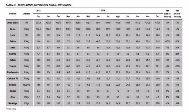 Em dezembro de 2015 a cesta básica em Cuiabá estava cotada a R$ 391,30. Já em janeiro deste ano a média verificada foi de R$ 427,90, segundo levantamento do Instituto Mato-grossense de Economia Agropecuária (Imea).