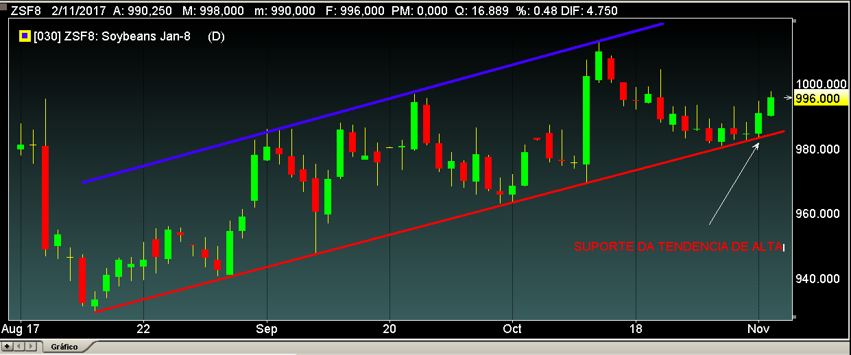 Depois de 4 dias testando o suporte da tendência de alta, com noticias de chuvas para o Centro-Oeste do Brasil e valorizacao do dolar, agora o mercado recebe notícias altistas. A primeira é a de que as fabricas de esmagamento na China melhoraram suas margens, devido à forte demanda interna. E a segunda é que o final de safra nos EUA está apresentando médias de produtividade muito inferiores, o que pode fazer com que os USDA reveja a produçao americana para abaixo de 120 milhões de tons em seu relatório de novembro ou dezembro.