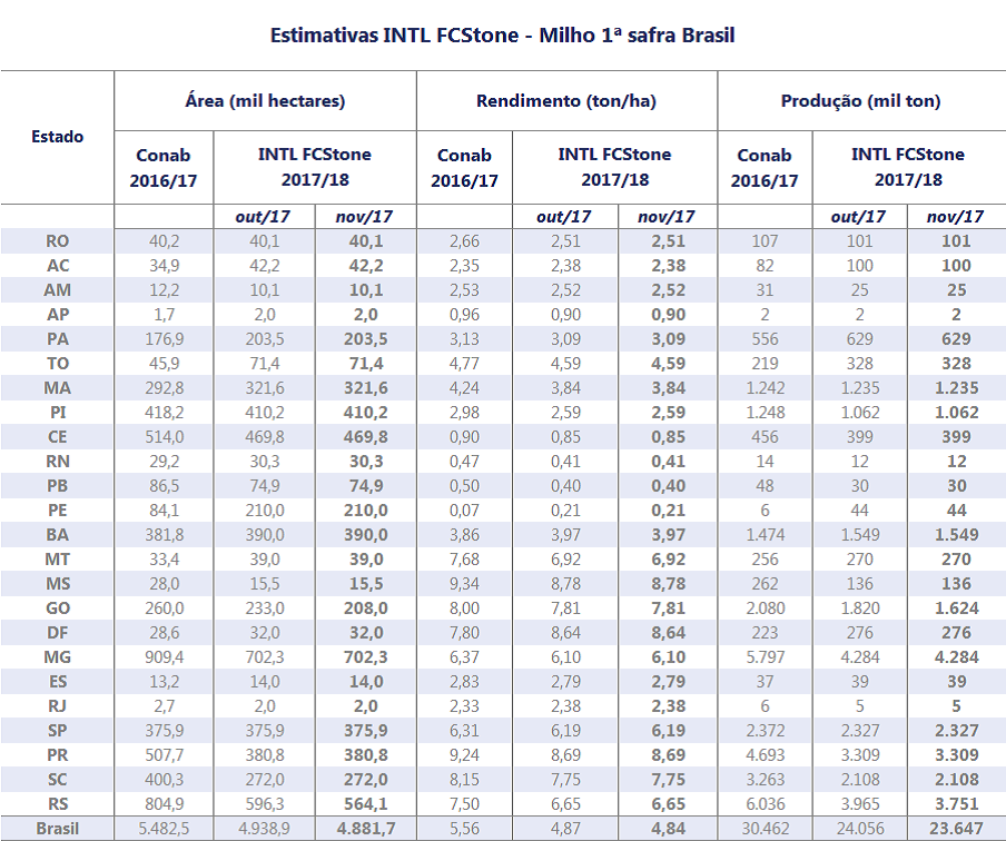 Já em relação ao milho, as perspectivas para a safra de verão apontavam para uma queda considerável de área, para abaixo de 5 milhões de hectares. Em sua revisão de novembro, a INTL FCStone trouxe um novo ajuste para a área plantada, que ficou em 4,88 milhões de hectares. Houve leves cortes no Rio Grande do Sul e em Goiás. Já a produtividade alcançou 4,84 toneladas por hectare. “Além do contexto de preços mais baixos, em meio à disponibilidade elevada, que resultou nesta considerável redução de área em comparação ao ciclo 2016/17, as chuvas um pouco mais tarde também trouxeram algumas preocupações para o milho.”, explica a consultoria.