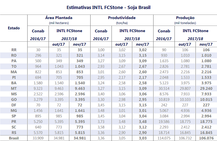 No caso da soja, o recuo decorreu de uma revisão da produtividade esperada, enquanto a área plantada foi mantida inalterada em 35 milhões de hectares. O atraso das chuvas no início do plantio, principalmente nas regiões central e norte, tem se refletido nos trabalhos de campo com a semeadura. “O regime de chuvas está se regularizando somente agora, no final de outubro e início de novembro”, destaca a INTL FCStone, em relatório divulgado nesta quarta-feira (01).