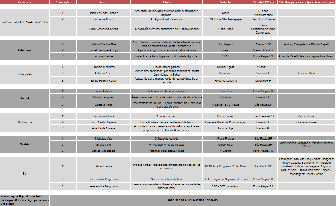 Nesta edição, 559 conteúdos jornalísticos concorreram ao prêmio. Os vencedores e o jornalista homenageado foram escolhidos pela Comissão Julgadora, que esteve reunida em 10 de agosto, em São Paulo (SP). O júri é composto por profissionais com experiência e conhecimento em comunicação e áreas correlatas ao agronegócio.