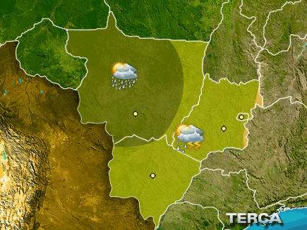 No centro-oeste de MT e oeste de MS o tempo permanece instável, com chuva a qualquer hora do dia. Sol, tempo abafado e pancadas de chuva a partir da tarde nas demais áreas.