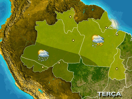 O tempo segue quente e úmido na Região. O dia é de sol entre muitas nuvens e chove a qualquer hora em RO, leste do AC e no sul do AM. Nas demais áreas chove de forma isolada a partir da tarde, mas pode chover já pela manhã no norte do TO.
