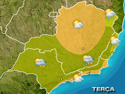 O calor ainda predomina na Região Sudeste. Tempo firme no noroeste de MG e no litoral do RJ e de SP. Chove de forma rápida e passageira no ES. Nas demais áreas, há condições de pancadas isoladas de chuva a partir da tarde.