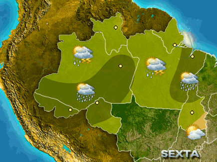 Tempo quente e úmido na região Norte. O sol aparece entre muitas nuvens e chove a qualquer hora no sul do AM, leste do AP e nordeste do PA. As outras áreas terão sol e pancadas de chuva a partir da tarde.
