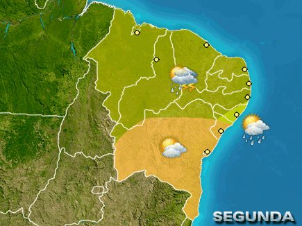 Segunda-feira de tempo seco na BA e SE. Chove a qualquer hora no litoral entre o MA, PI, CE e na costa do RN e PB, com risco de chuva forte e volumosa. Nas demais áreas ocorrem pancadas localizadas.