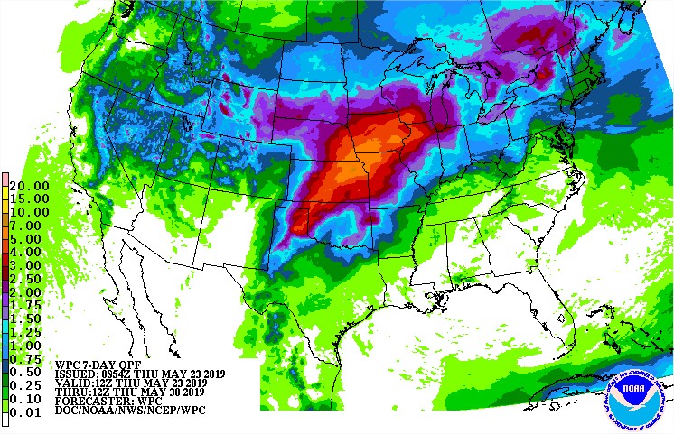 E de acordo com a última previsão do NOAA, o serviço oficial de clima do governo americano, nos sete dias próximos as chuvas fortes ainda não dão trégua. A maior parte do Centro-Oeste e parte das Planícies ainda poderiam registrar acumulados de até 100 mm neste intervalo, como ilustra a imagem abaixo. O mapa refere-se ao período de 23 a 30 de maio.